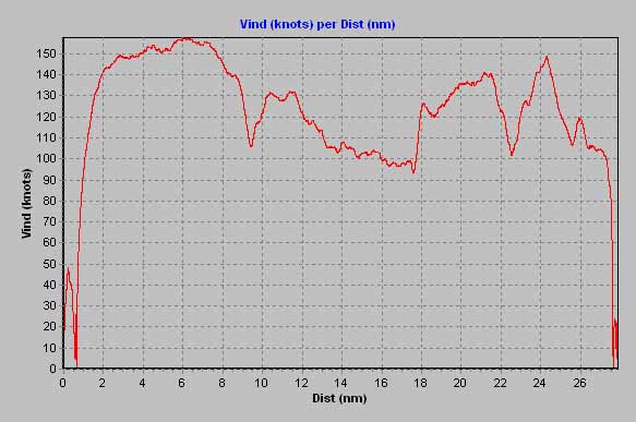As with Sir Vilk's and Sir Hak's graphs, a small drop in indicated speed after the load was dropped, as shown by the downwards spike in the graph just before the 18nm line. Prelimanary analysis seem to indicate the sudden increase in altitude after the drop (with the aircraft suddenly 23,000 pounds lighter) causes this drop in airspeed. Comments on this will be welcome (send to the esp mailing list please).